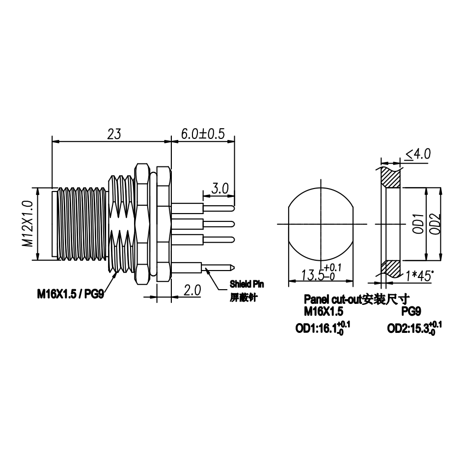 M12 Male Panel Mount, PCB Type, Front Fastened, Shielded Pin