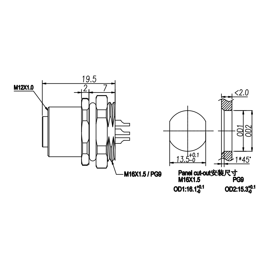 M12 Female Panel Mount, Solder Type, Rear Fastened